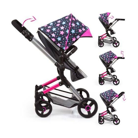 The Neo Vario combi doll’s pram, designed for dolls up to 52 cm, features an adjustable handle (62 – 79 cm) for easy adaptation to a child’s height. The carrycot can be mounted facing either direction, and the reversible handle allows movement on both sides. The angle of the carrycot is adjustable, converting the pram into a jogger pushchair. A carrier’s cover protects the doll from sun and wind in any position. With pivoted front wheels, it ensures stable cornering. This foldable pram includes a versatile bag with a long handle for shoulder carrying and two short handles for hand carrying, plus a zipper for secure closure. The integrated shopping basket offers additional storage space.