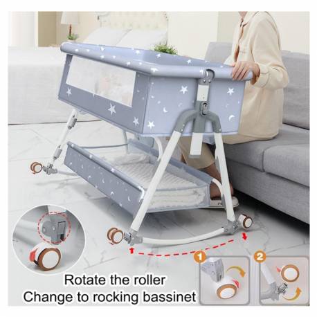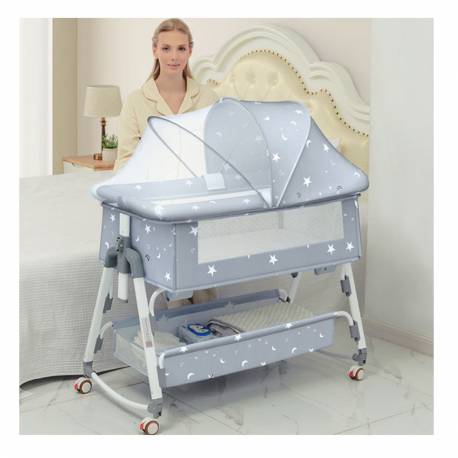Multifunctional 5-in-1 baby cradle. It is foldable, has a changing table, mosquito net, spacious storage basket for all the essentials and is washable and made of safe non-toxic materials.