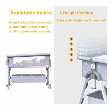 - The height is adjustable in 5 levels (77/80/83/86/89cm), with an opening side, to adapt to the parents’ bed.