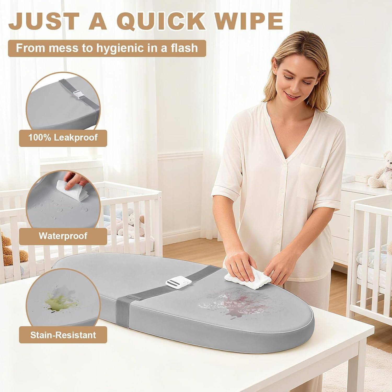- EASY TO MAINTAIN: With a completely waterproof soft, firm padding, this must-have changing pad can be easily wiped clean in seconds, so you don’t have to worry about accidents.