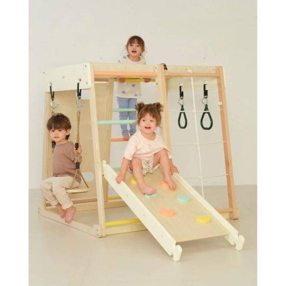 Featuring multiple play surfaces—including a cotton rope wall, wooden peg wall, hanging rings and a ladder with colourful dowels—this versatile Pikler-style set encourages strength, coordination and gross motor development. Pair it with the included climbing board for sliding, climbing, or imaginative play setups.