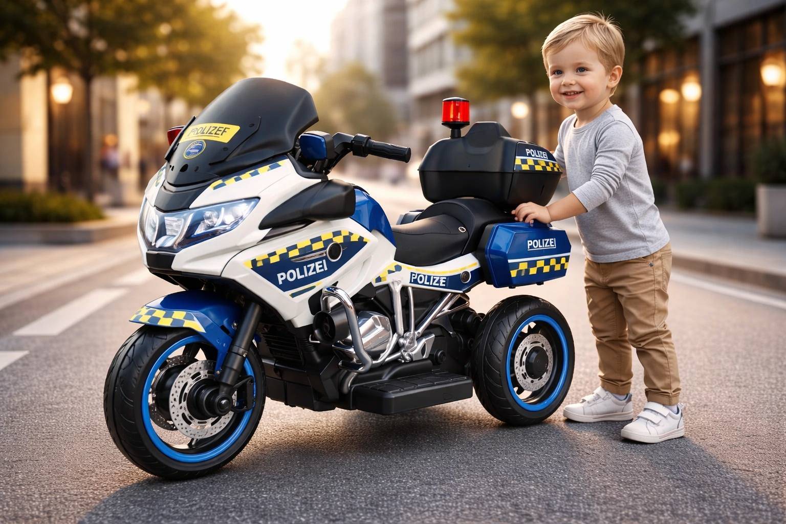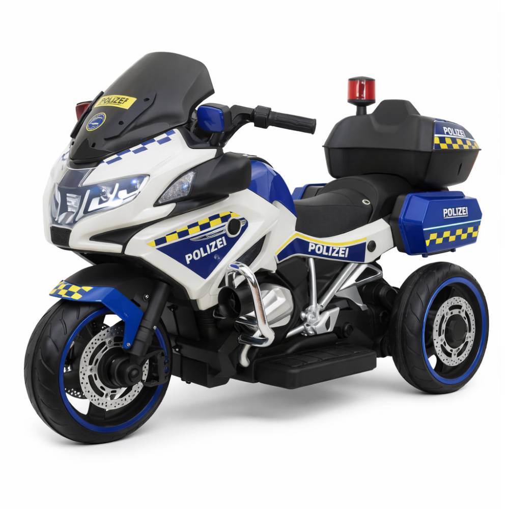 Τρίτροχη ηλεκτρική μοτόρα αστυνομίας 12V σε άσπρο χρώμα, με μπαταρία 12V7AH και 2 μοτέρ 390 για εντυπωσιακή εμφάνιση, σταθερότητα και συναρπαστικό παιχνίδι ρόλων. Ιδανική για παιδιά που αγαπούν τις μοτόρες, τα οχήματα δράσης και την αστυνομική περιπέτεια.