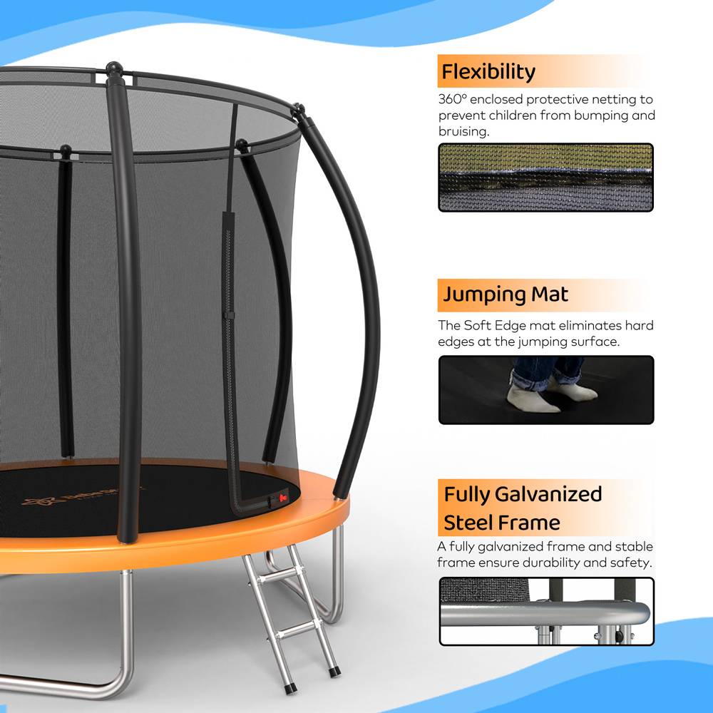Το τραμπολίνο διαθέτει σκάλα για καλύτερη πρόσβαση και προστατευτικό δίχτυ, το οποίο εξασφαλίζει την απαιτούμενη ασφάλεια κατά τη χρήση.