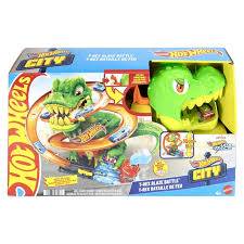 Χρησιμοποιήστε επικές αγωνιστικές δεξιότητες για να προστατέψετε το Hot Wheels City από ένα δυναμικό T-Rex που θέλει να φάει όλα τα αυτοκίνητα! Τα παιδιά λανσάρουν το συμπεριλαμβανόμενο όχημα σε κλίμακα 1:64 και κάνει ζουμ γύρω από το dino με τρία πιθανά αποτελέσματα: να φαγωθεί και να βγει έξω, να χτυπήστε μια παράκαμψη για ανεφοδιασμό καυσίμων ή να κατακτήστε το θηρίο και να σώσετε φίλους. Κάθε φορά που τα αυτοκίνητα περνούν με φόρα, τα μάτια του T-Rex γυρίζουν και τα χέρια τρέμουν μέχρι τελικά να καταρρεύσει! Υπάρχει αποθηκευτικός χώρος για πρόσθετα αυτοκίνητα και λεπτομέρειες παιχνιδιού με ώθηση για ανοιχτή αφήγηση. Τα χρώματα και τα διακοσμητικά μπορεί να διαφέρουν. Αντιμετωπίστε ένα πεινασμένο T-Rex που έχει επιτεθεί στον πυροσβεστικό σταθμό Hot Wheels City με ένα αυτοκίνητο-παιχνίδι κλίμακας 1:64! Το σετ παιχνιδιού διαθέτει μια μεγάλης κλίμακας δεινόσαυρων που έχει μάτια που περιστρέφονται κάθε φορά που τα αυτοκίνητα περνούν μέχρι να τον χτυπήσουν! Εκτοξεύστε αυτοκίνητα αρκετά δυνατά για να γυρίσετε τα μάτια και να χτυπήσετε τα δόντια του ντίνο μόνο για να φάει το αυτοκίνητο και μετά να βγει έξω! Φορτώστε ξανά και εκκινήστε ξανά, αλλά αυτή τη φορά περάστε από το πρατήριο καυσίμων. Μπορεί επίσης να γεμίσετε για την επόμενη διαδρομή! Μην τα παρατάς τώρα! Με τον ανεφοδιασμό να έχει ολοκληρωθεί, εκτοξεύστε ξανά και αποκτήστε το K.O., σώζοντας φίλους και το Hot Wheels City.