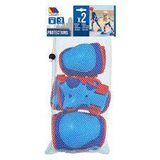 Complete set of adjustable blue knee pads, elbow pads, and wrist guards for boys and girls.
